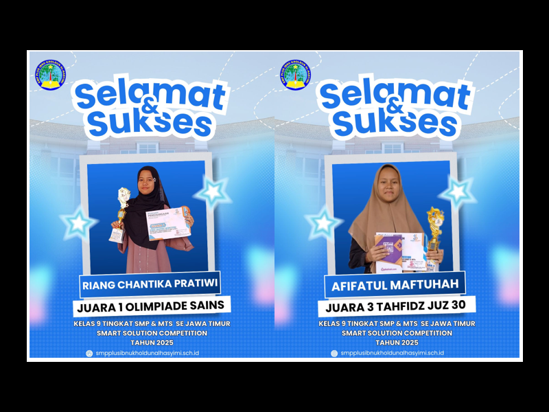 Besuki, 19 Oktober 2025 SMP Plus Ibnu Kholdun Al Hasyimi, mengirimkan utusan siswa-siswi dalam Kegiatan Olimpiade yang diikuti adalah Mata Pelajaran Sains, Matematika, Bahasa Inggris & Tahfidz, yang dilaksanakan oleh Bimbel Smart Solution Competition Situbondo Tahun 2025 Se Jawa Timur, dan Alhamdulillah hasilnya memuaskan siswa-siswi SMP Plus Ibnu Kholdun Al Hasyimi Mendapatkan Juara 1 Kategori Olimpiade Sains SMP & MTs Kelas 9 Se-Jawa Timur, yaitu Riang Chantika Pratiwi, dan Mendapatkan Juara 3 Kategori Olimpiade Tahfidz SMP & MTs Kelas 9 Se-Jawa Timur. Dari itu SMP Plus Ibnu Kholdun Al Hasyimi dapat bersaing dengan sekolah-sekolah diluar Kabupaten Situbondo.